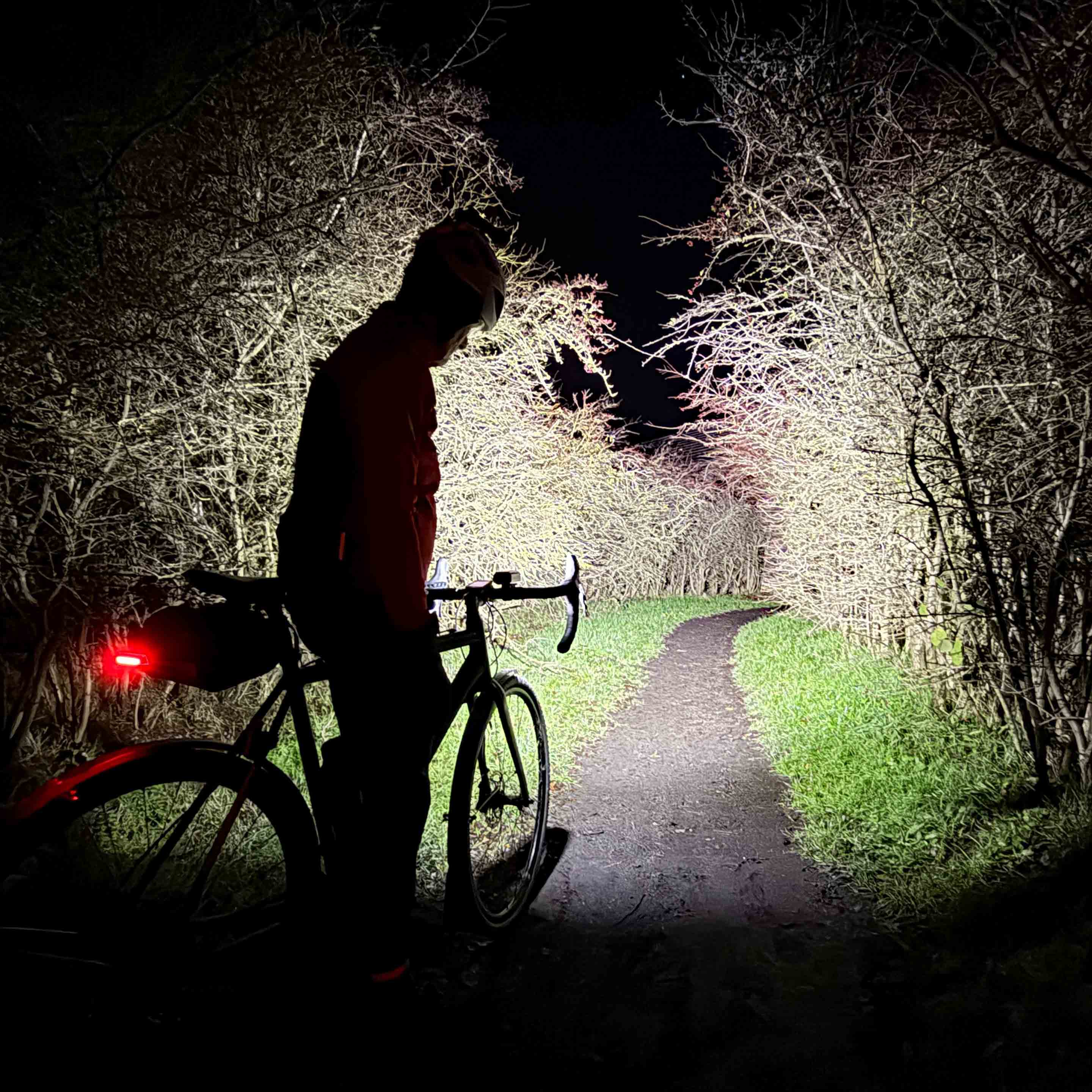 The lower power settings provide a good spread of natural feeling, quite white, light. At times though, the spread did throw shadows of the shifter hoods onto the trail edges, but once you’ve identified the dark shapes in your peripheral vision you can focus on the trail ahead. In the more powerful settings (1500 and 2400 lumens) the way ahead is bright and clear and unless you’re heading into the twistiest, rootiest (crossing into MTB terrain) trails, the bar-mounted Mega Drive 2400+ should be sufficient on its own. The added-flexibility provided by pairing it up with a “see-round-corners” helmet-mounted partner light means all bases would be covered.