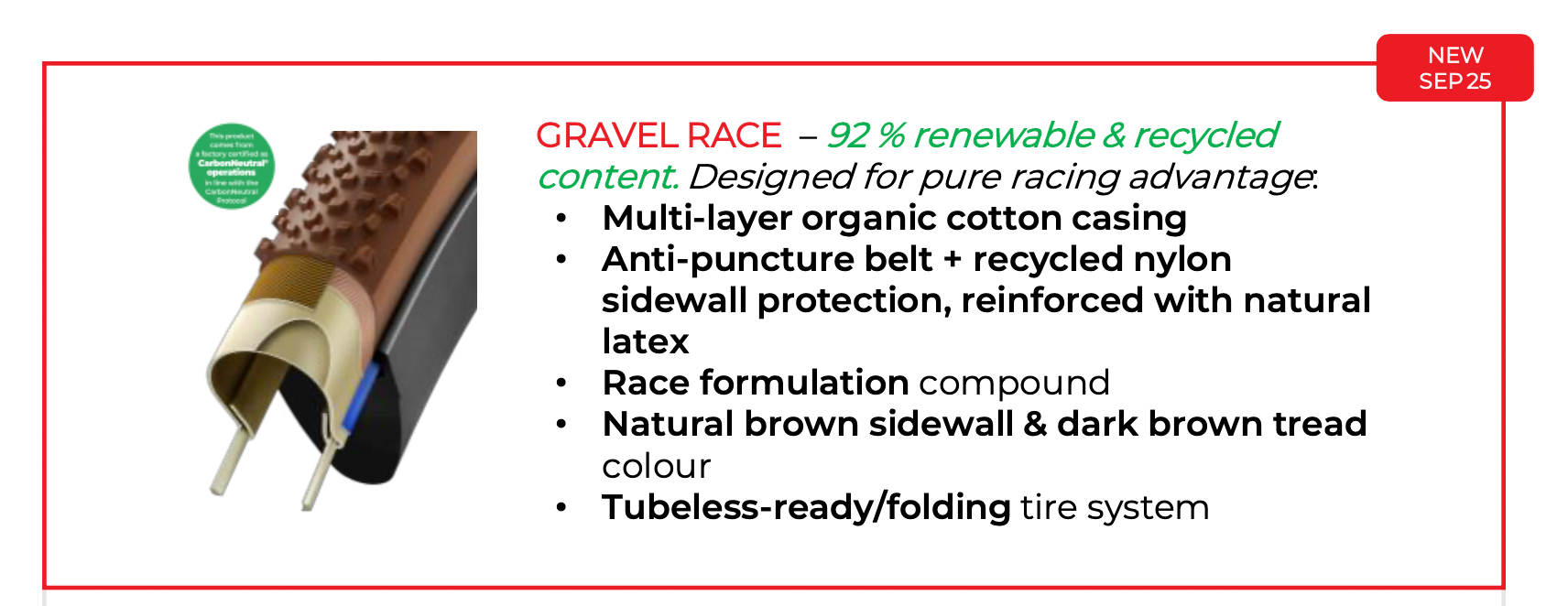 Described by Vittoria as "Naturally Fast" their new range of tyres have some impressive green credentials - "Terreno PRO tyres are made with 92% renewable and recycled materials. They feature an organic cotton casing (cotton is the magic in Vittoria’s most high-end and technologically advanced products) delivering an unmatched ride feel. The casing also includes recycled nylon from discarded fishnets (Seawastex®), creating a unique and highly resistant blend. Add soybean oil and rice husk ash silica, and you have a tyre that is Naturally Fast. They are also produced in the world’s only CarbonNeutral® operations certified tyre factory. Compared to the Gravel Endurance construction, the new PRO one achieves an average carbon footprint reduction of 35%"