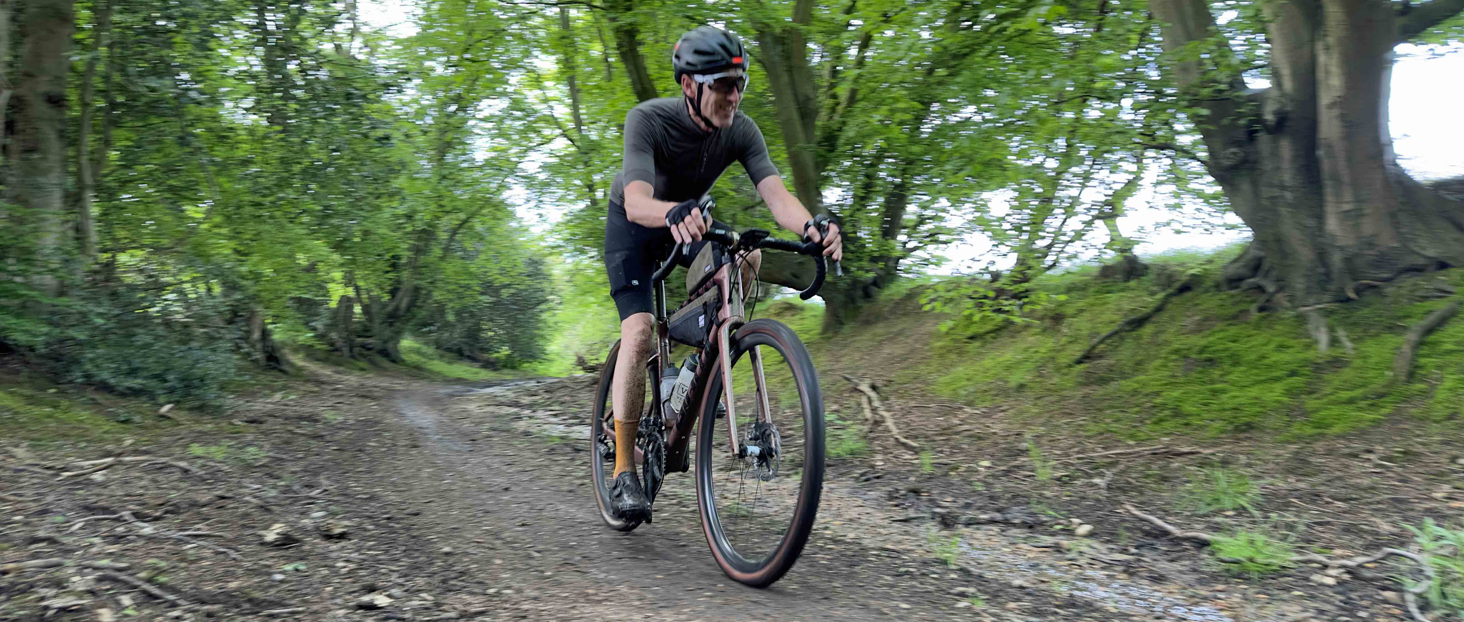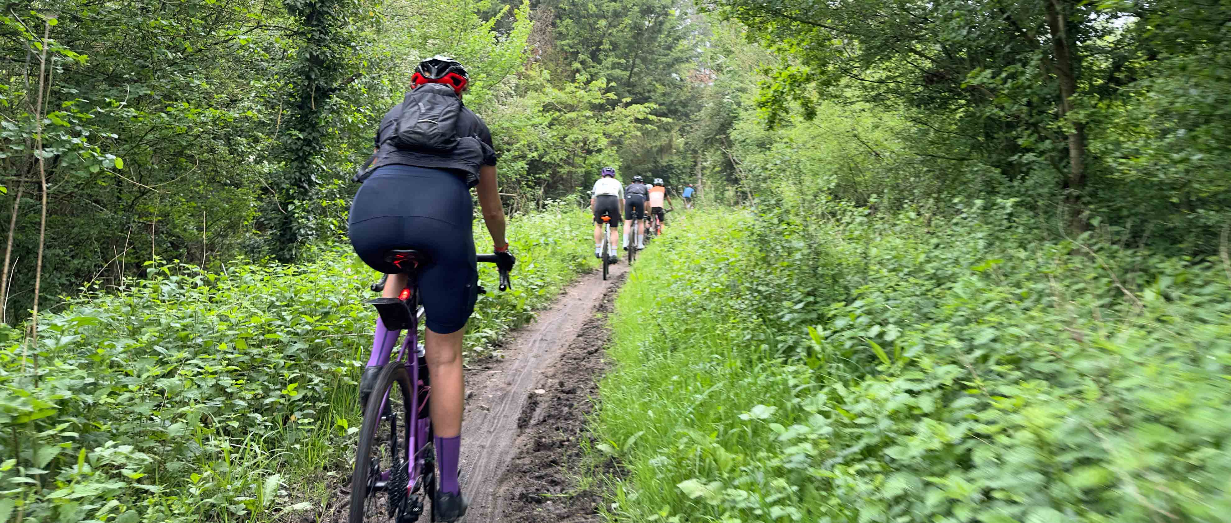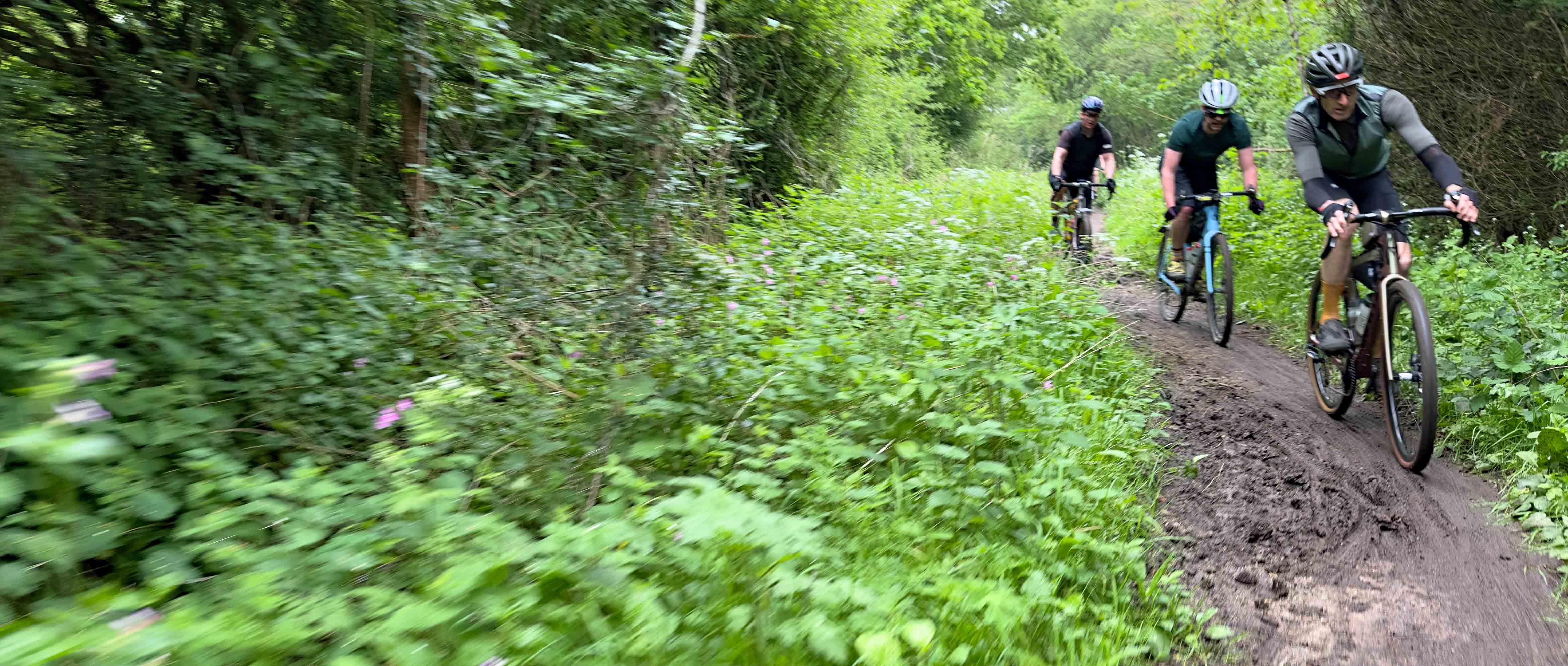 “Do you think I’m just jinxed with tubeless tyres?” asked Ian with a combination of disappointment and frustration apparent in his voice. We were deep in the middle of Hoddesdon Park Wood, a beautiful broadleaf forest with a vehicle-width gravel trail running through the centre of it. The dense foliage meant there were some patches where the sunlight hadn’t penetrated and the clayey soil, high water table and popularity of horse riding in the area meant some of the trails were impressively ‘clarty’. As we stopped to try and encourage (unsuccessfully) the air to stay inside Ian’s rear tyre, we were part way up a short, slithery climb. We had just descended at high speed, with a mix of bravado and foolhardiness known only to mountain bike riders transplanted onto gravel bikes for a day. With enough speed (and a large dollop of good luck) it was possible to carve a route straight through the middle of the worst of the mud, but the high-pitched giggles and occasional yelps that were being carried through the forest behind us, made us realise that although not everyone was as successful as we had been at navigating the swampy descent, they all sounded like they were having a fun time anyway.