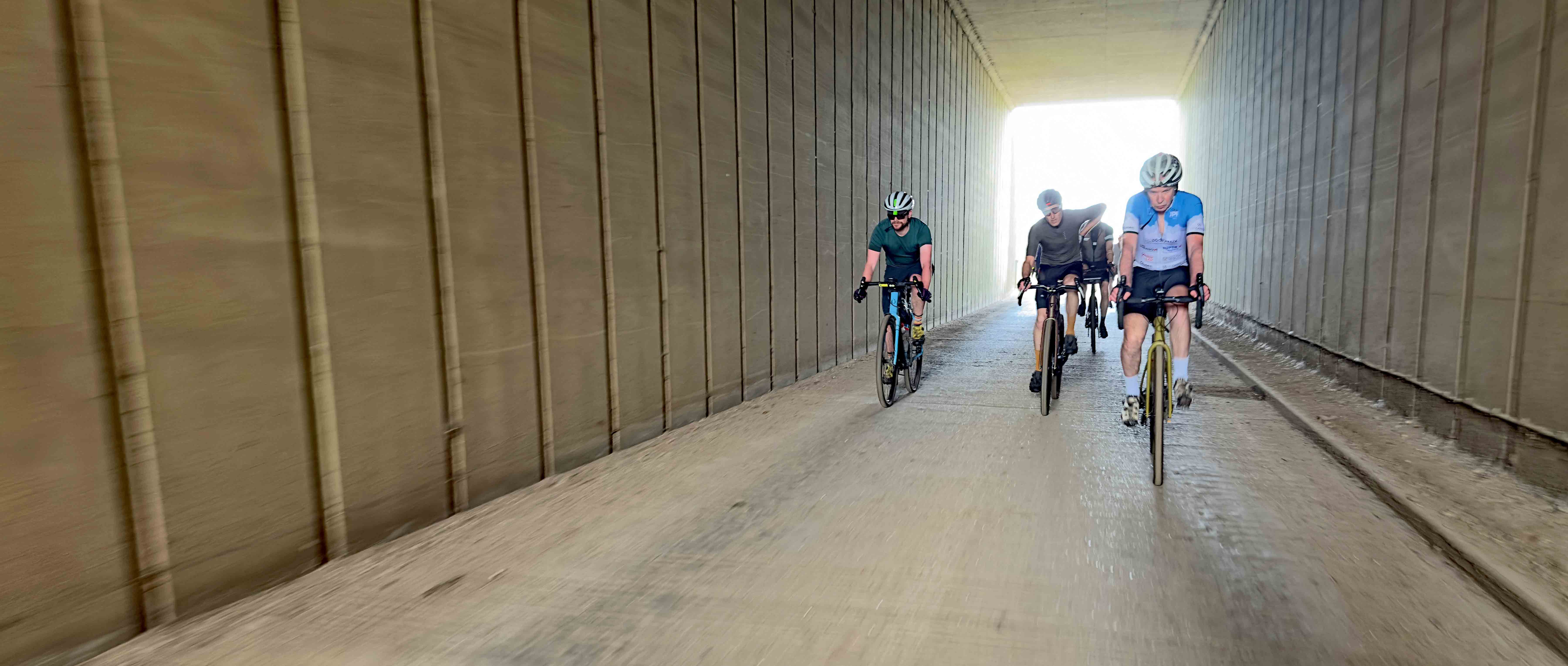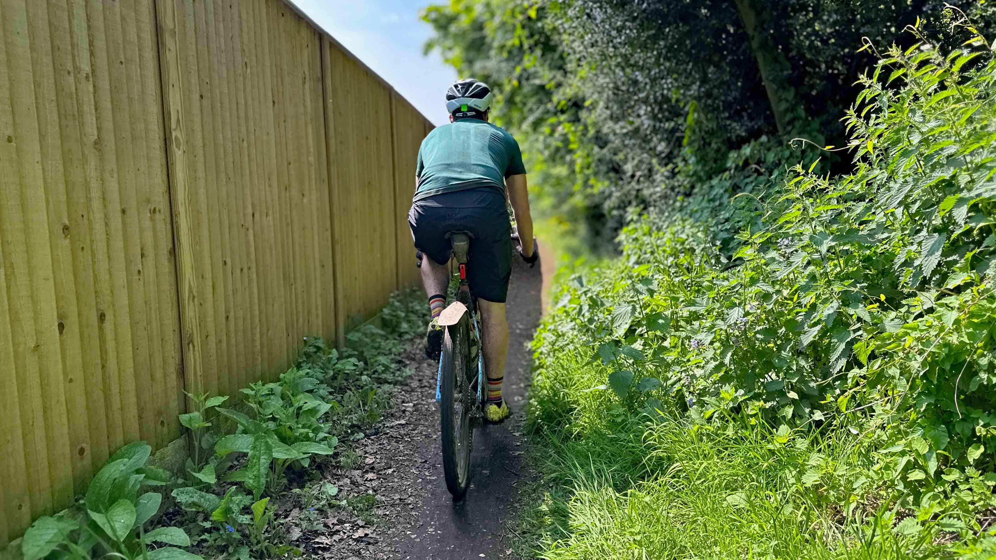Until this point, apart from a very light bespeckling of shins, the trails had been remarkably dry. As the sun started to burn through the early morning grey fug, you could practically feel the mood of our ragtag peloton lifting further. Unnecessary layers were removed and packed away. Pale skin was exposed to levels of Vitamin D it had not experienced since the previous summer. It was so bright it made you squint, a feeling akin to having been shut in a dark cellar all winter and then suddenly released onto a desert island.