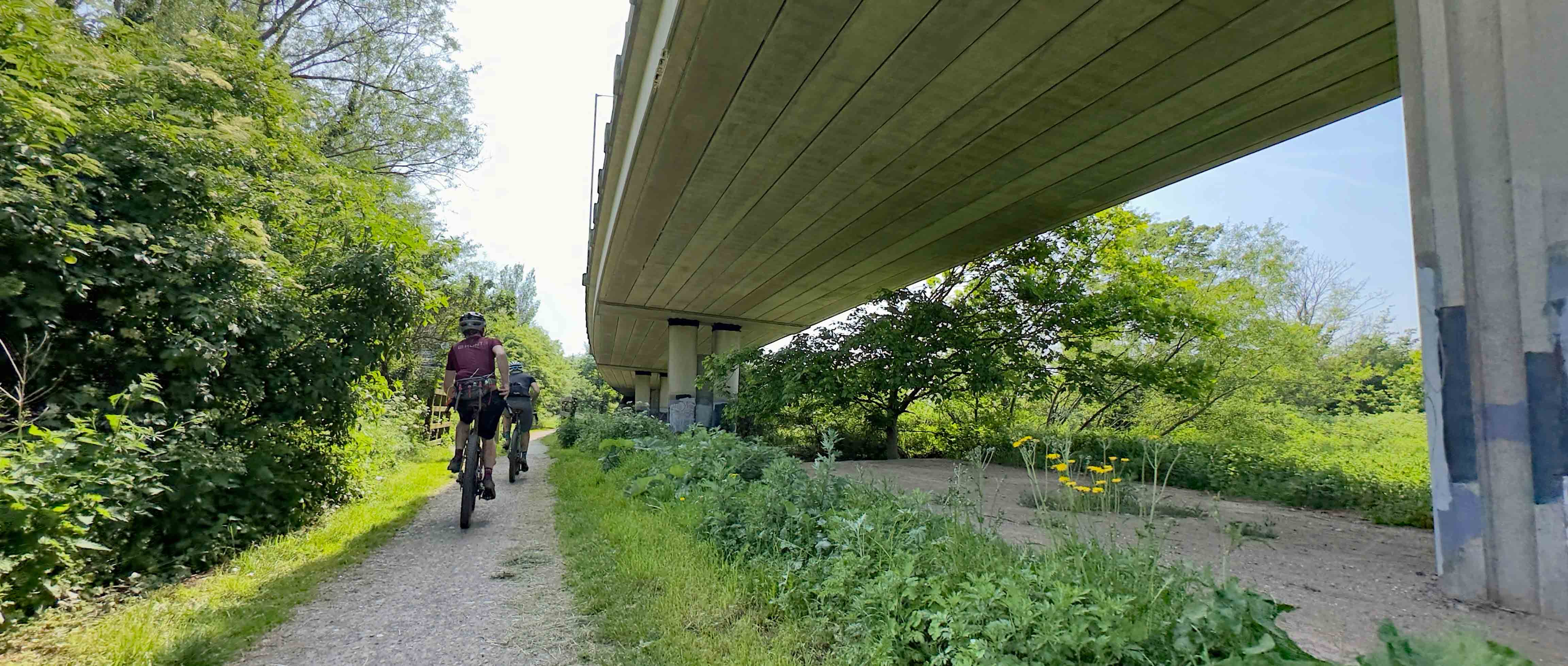After exiting the dappled tranquillity of the forest, it seemed just a few short minutes before we were dumped unceremoniously back into urbanville. Concrete underpasses, graffiti, evidence of homelessness – all a bit of a shock after the earlier rural riding, but there was some surprisingly good riding nonetheless.