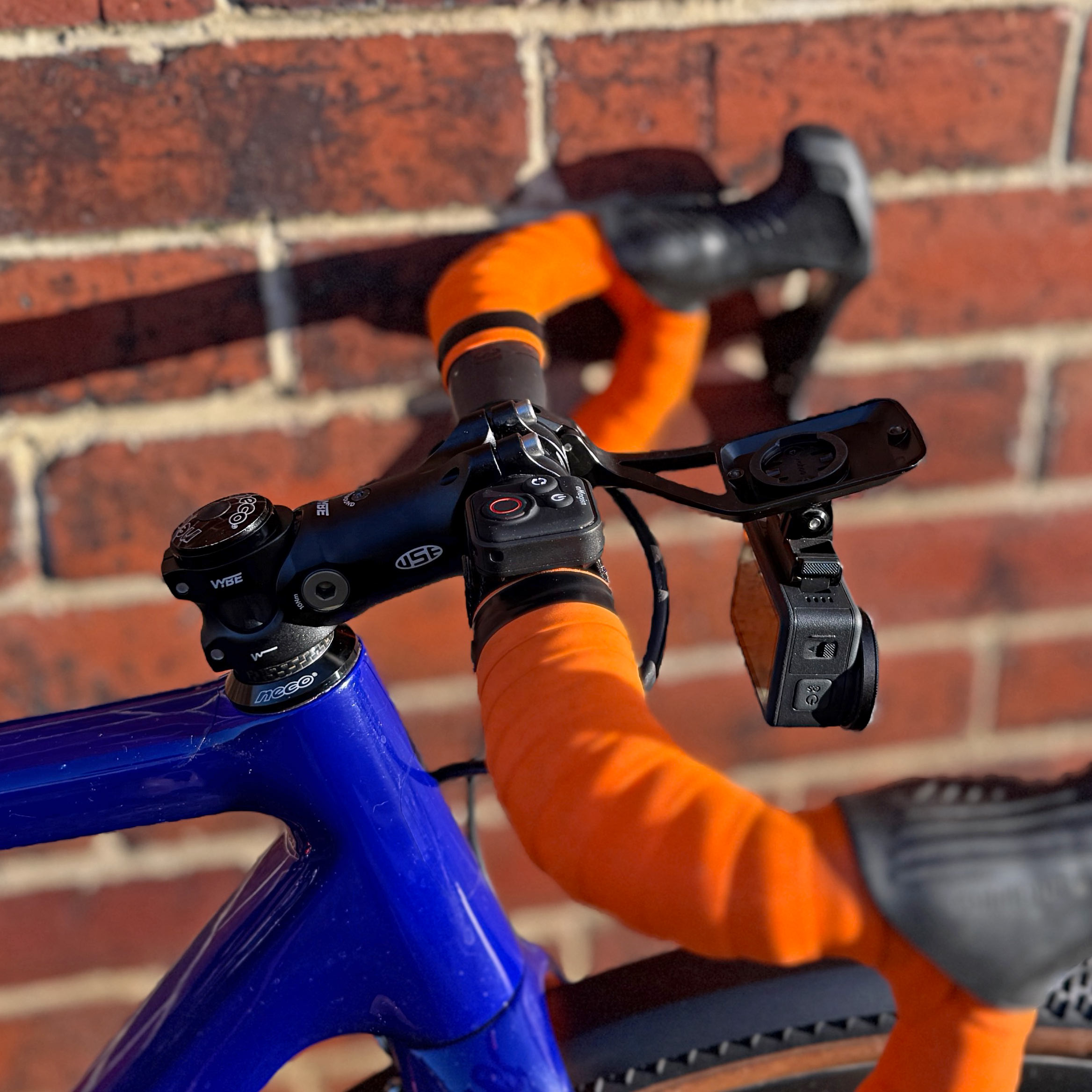 - Handlebar-mounted – the extra vibration from away-from-the-road riding means there’s a risk of the camera mount rotating around the handlebars. When you’re using lightweight carbon bars, you don’t want to torque the mounting bolts too tightly in case they crush the carbon.