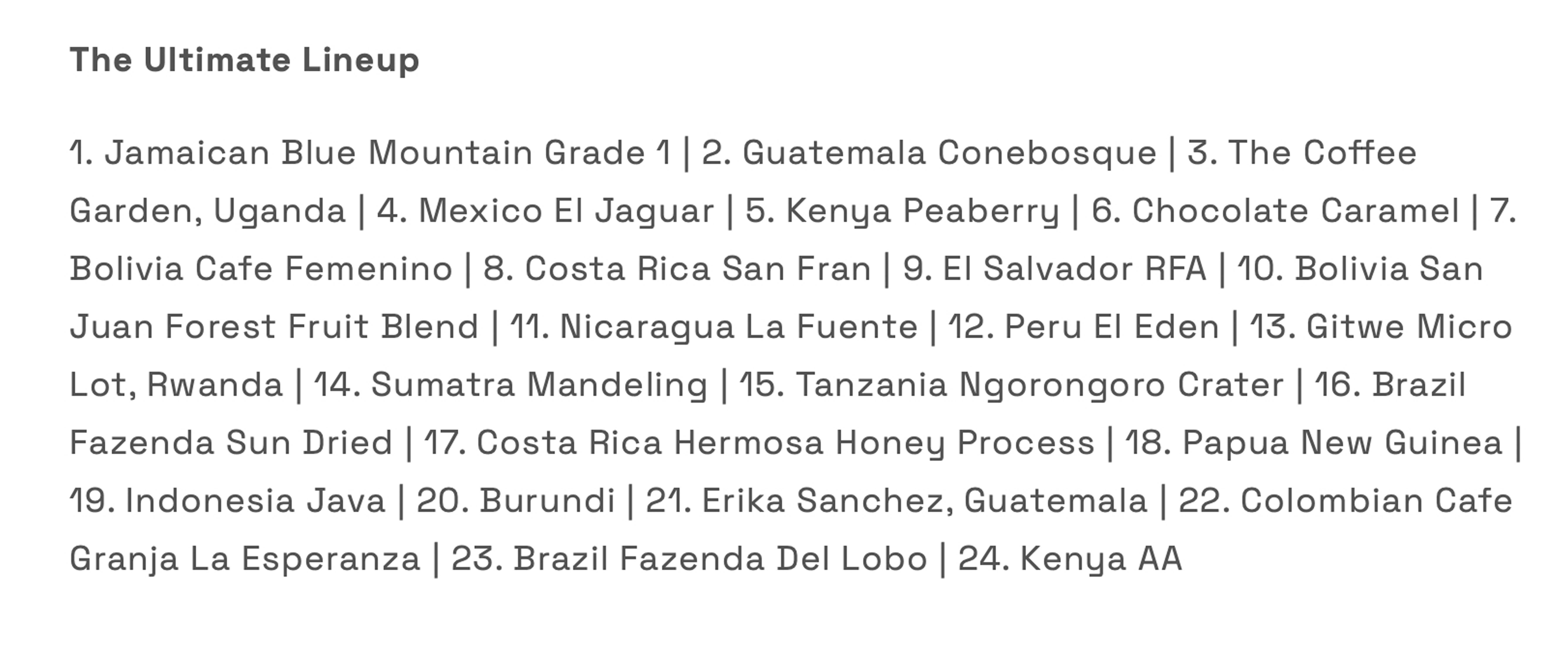 Anyone who has ever ground their own beans at home will know that getting that grind ‘dialled in’ just right can be a bit of a lottery, so you might wonder about the sense of offering 18g servings? The answer is that freshly ground beans always offer the best possible flavour (compared to pre-ground coffee), so it’s generally worth the gamble that your grind might not be quite right. If nothing else, having 24 different beans to try will be a good way to help you improve your barista skills….