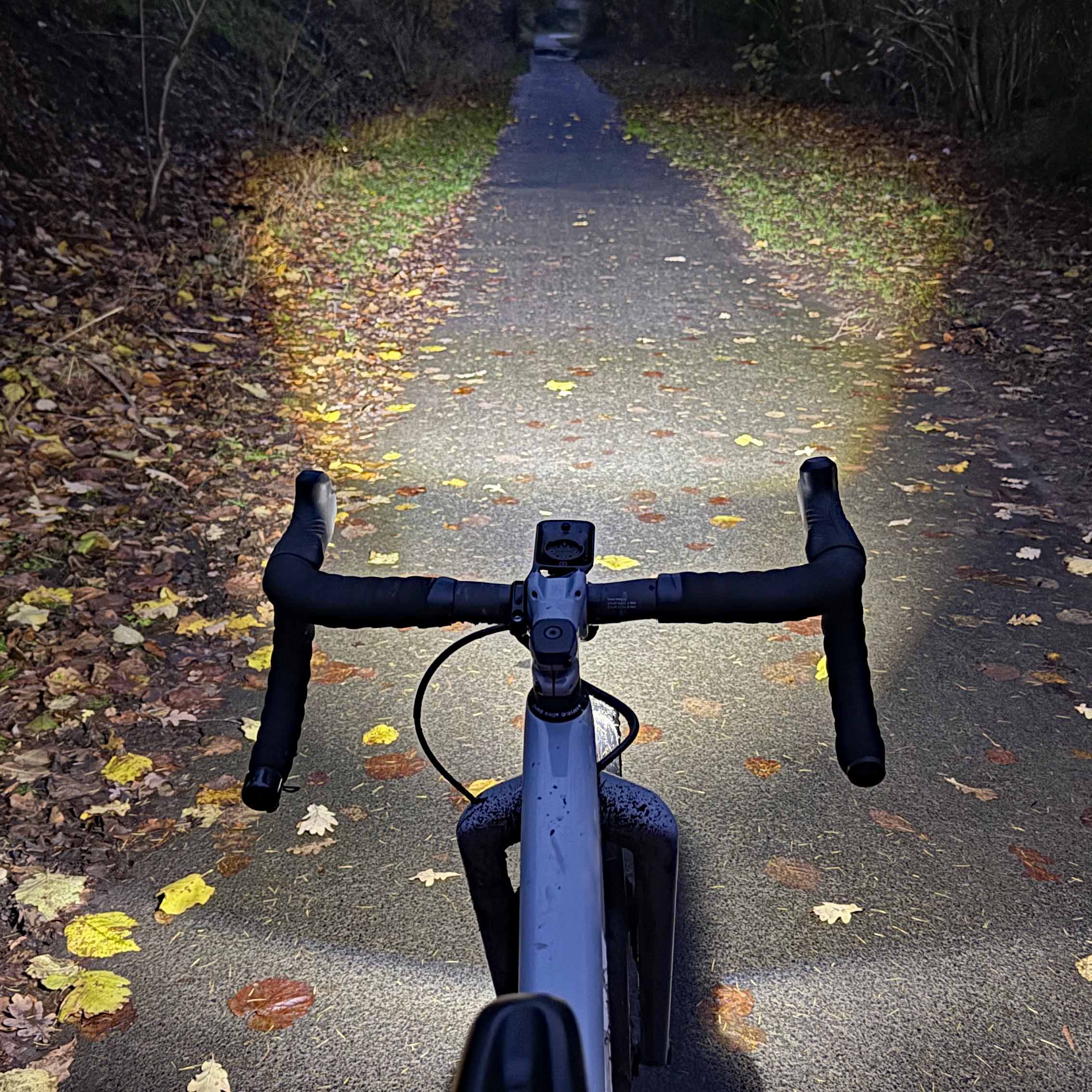 The lower power settings provide a good spread of natural feeling, quite white, light. At times though, the spread did throw shadows of the shifter hoods onto the trail edges, but once you’ve identified the dark shapes in your peripheral vision you can focus on the trail ahead. In the more powerful settings (1500 and 2400 lumens) the way ahead is bright and clear and unless you’re heading into the twistiest, rootiest (crossing into MTB terrain) trails, the bar-mounted Mega Drive 2400+ should be sufficient on its own. The added-flexibility provided by pairing it up with a “see-round-corners” helmet-mounted partner light means all bases would be covered.
