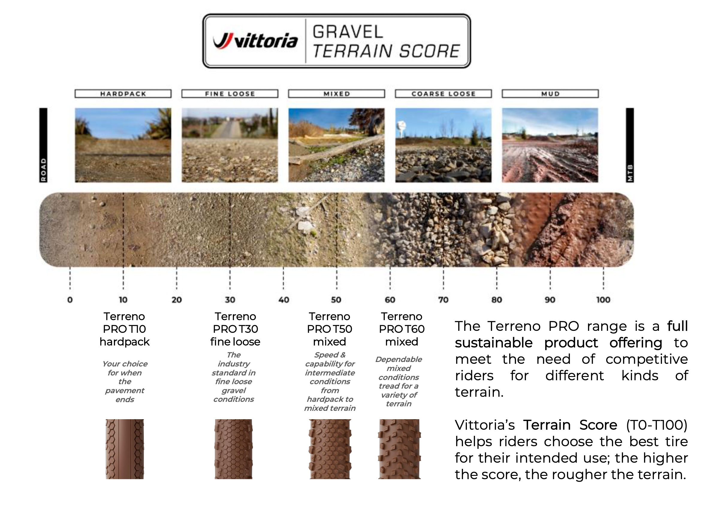 Vittoria offer the new Terreno Pro tyres in four different versions - T10 for hardback, T30 for fine/loose conditions, T50 for hardpack/mixed conditions and T60 for mixed/loose conditions. They are currently available in sizes from 700x35 up to 700x45mm, with larger 50 and 55mm variants being available in the "near future". Prices are from €88.95 per tyre, but you can get a 15% if you sign up for their newsletter.