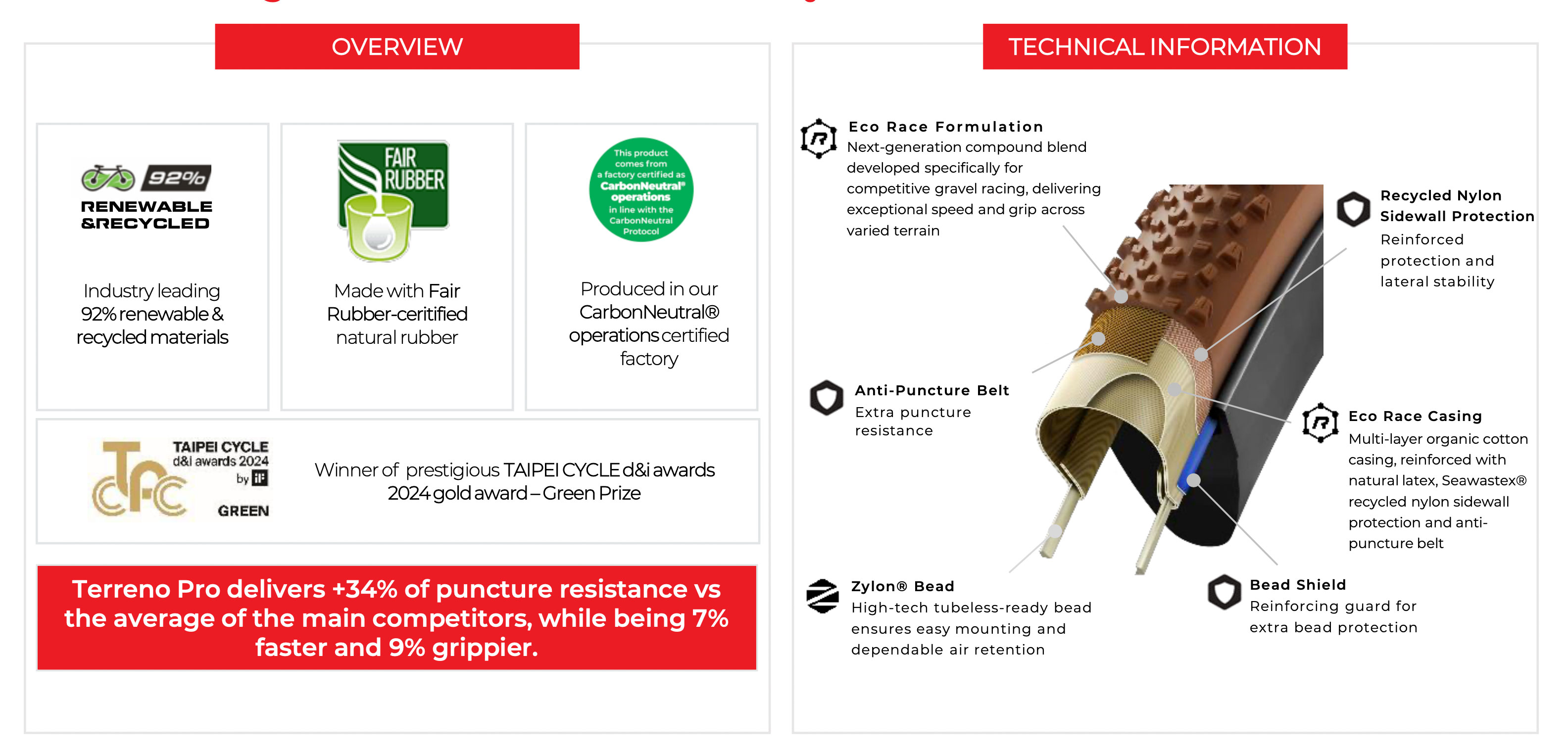 Described by Vittoria as "Naturally Fast" their new range of tyres have some impressive green credentials - "Terreno PRO tyres are made with 92% renewable and recycled materials. They feature an organic cotton casing (cotton is the magic in Vittoria’s most high-end and technologically advanced products) delivering an unmatched ride feel. The casing also includes recycled nylon from discarded fishnets (Seawastex®), creating a unique and highly resistant blend. Add soybean oil and rice husk ash silica, and you have a tyre that is Naturally Fast. They are also produced in the world’s only CarbonNeutral® operations certified tyre factory. Compared to the Gravel Endurance construction, the new PRO one achieves an average carbon footprint reduction of 35%"