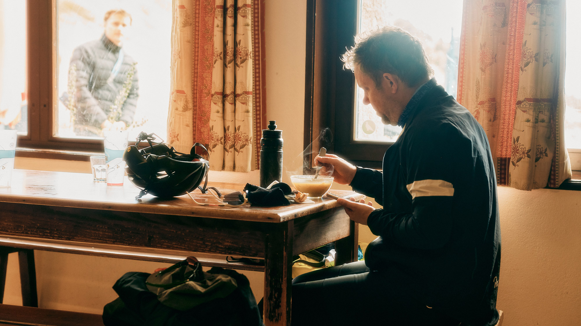 During Le Pilgrimage, riders are well taken care of at checkpoints and this year’s first one was no different: steaming fondue fromage with baguettes awaited at the end of the gruelling climb. Local white wine, a sip of génépi… Riders took a seat, enjoyed the views, the food and shared their first experiences.
