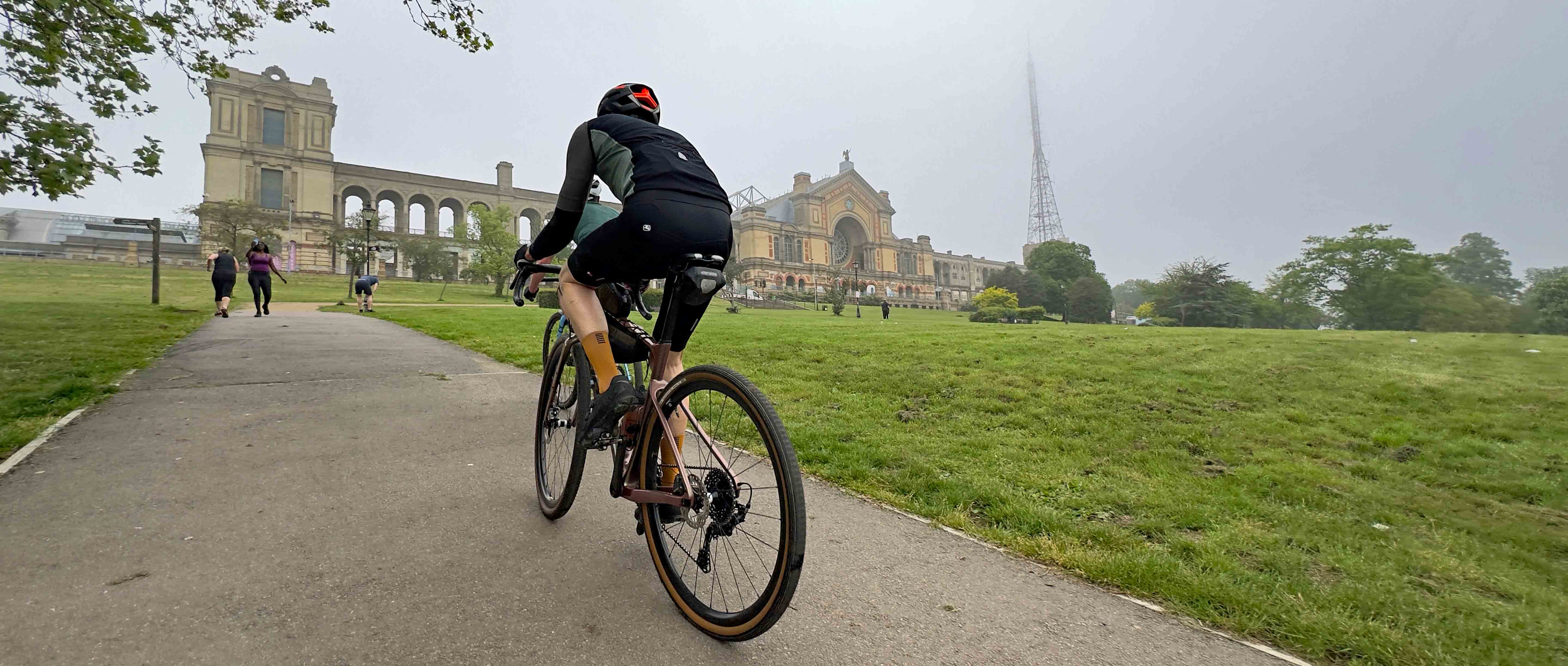 Despite its urban start, the Diproses do a great job each year of funnelling riders out of town via an interesting route. This year was no exception, with a combination of minor roads, segregated bike paths, urban cut-throughs and little-known public rights of way. The early highlight was the short-but-sharp climb up to Alexandra Palace. At a nosebleed inducing 89m above sea level, there are normally great views available as you arrive at the top of the ridge on which ‘Ally Pally’ is situated, but a foggy start to the day meant views were a little more limited when we passed through.