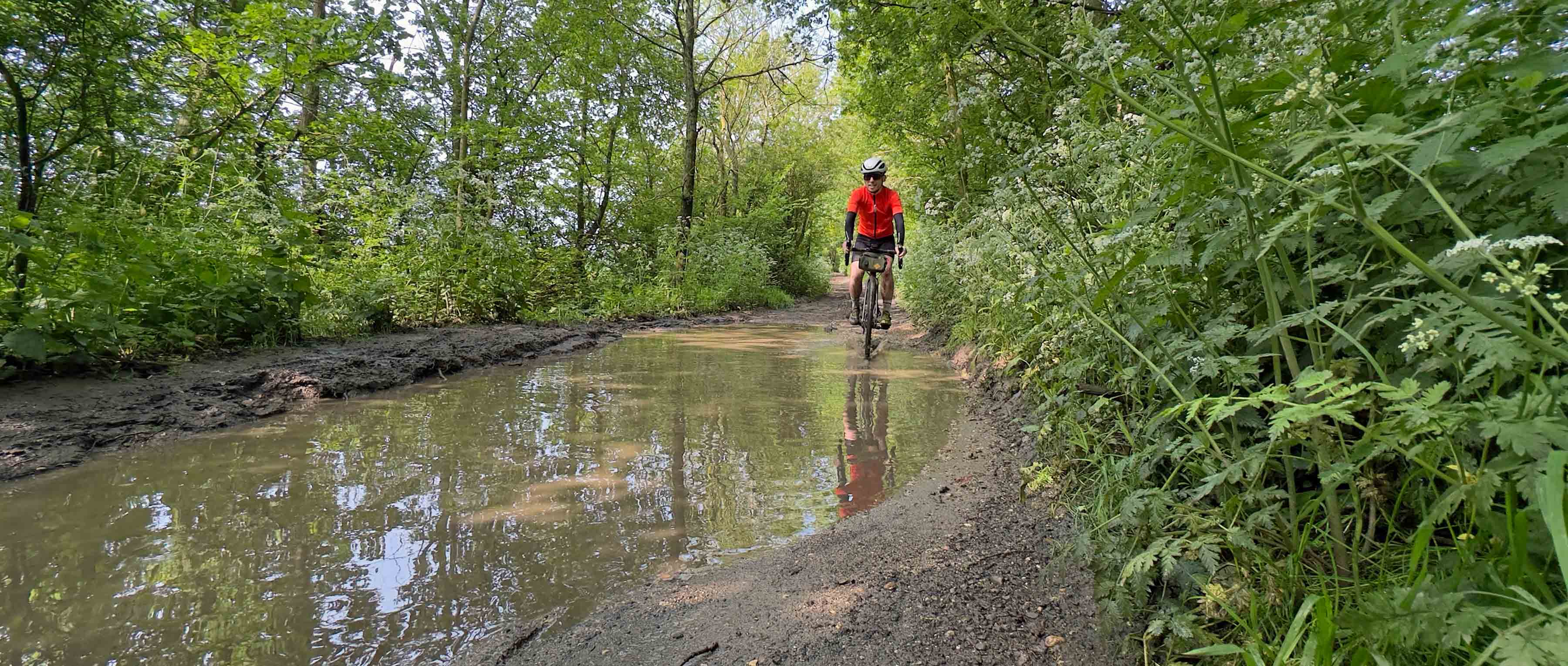 Of course, five minutes later, the realisation hit that a few minutes of glorious sunshine was not going to undo the misery of the previous six months of monsoon and we were met with wall-to-wall puddles. It was interesting watching the approach of different riders to the enormous puddles. Some threw caution to the wind and sailed straight through, minor bow waves pushed out in front of them. Others tiptoed around the edges, hoping to avoid besmirching their box-fresh white socks. Some riders had a slightly resigned air, as though riding through hub-deep puddles was the lot of a British gravel rider. Others’ expressions displayed confusion and disappointment, as though they expected the trails to have instantly dried up.