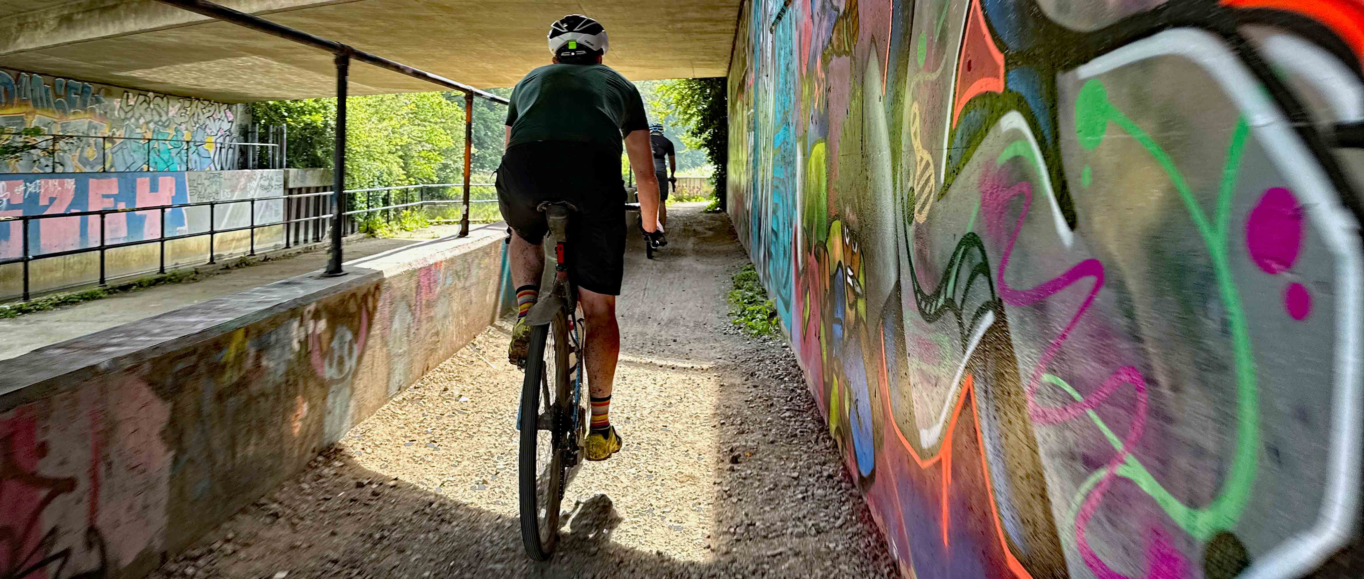 After exiting the dappled tranquillity of the forest, it seemed just a few short minutes before we were dumped unceremoniously back into urbanville. Concrete underpasses, graffiti, evidence of homelessness – all a bit of a shock after the earlier rural riding, but there was some surprisingly good riding nonetheless.