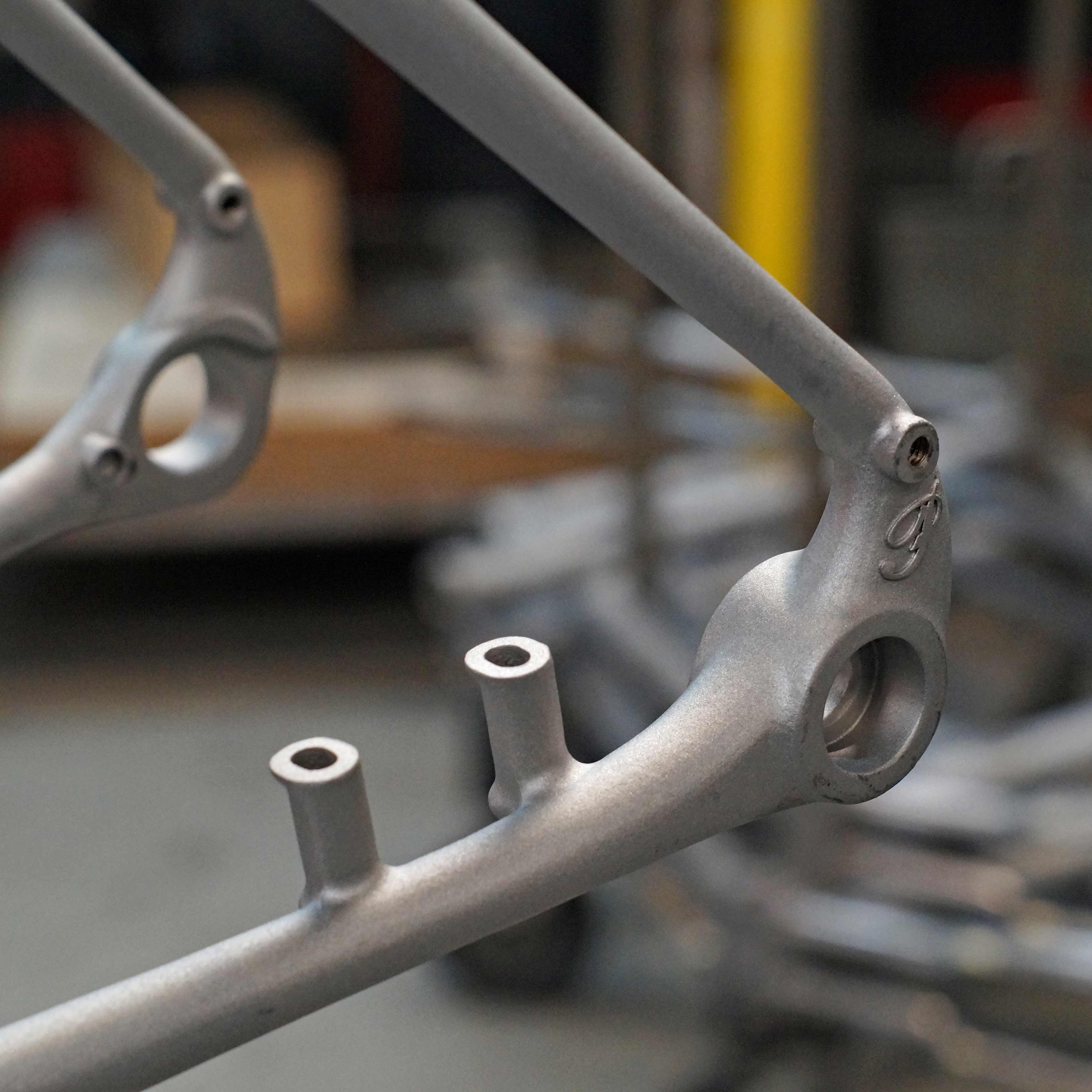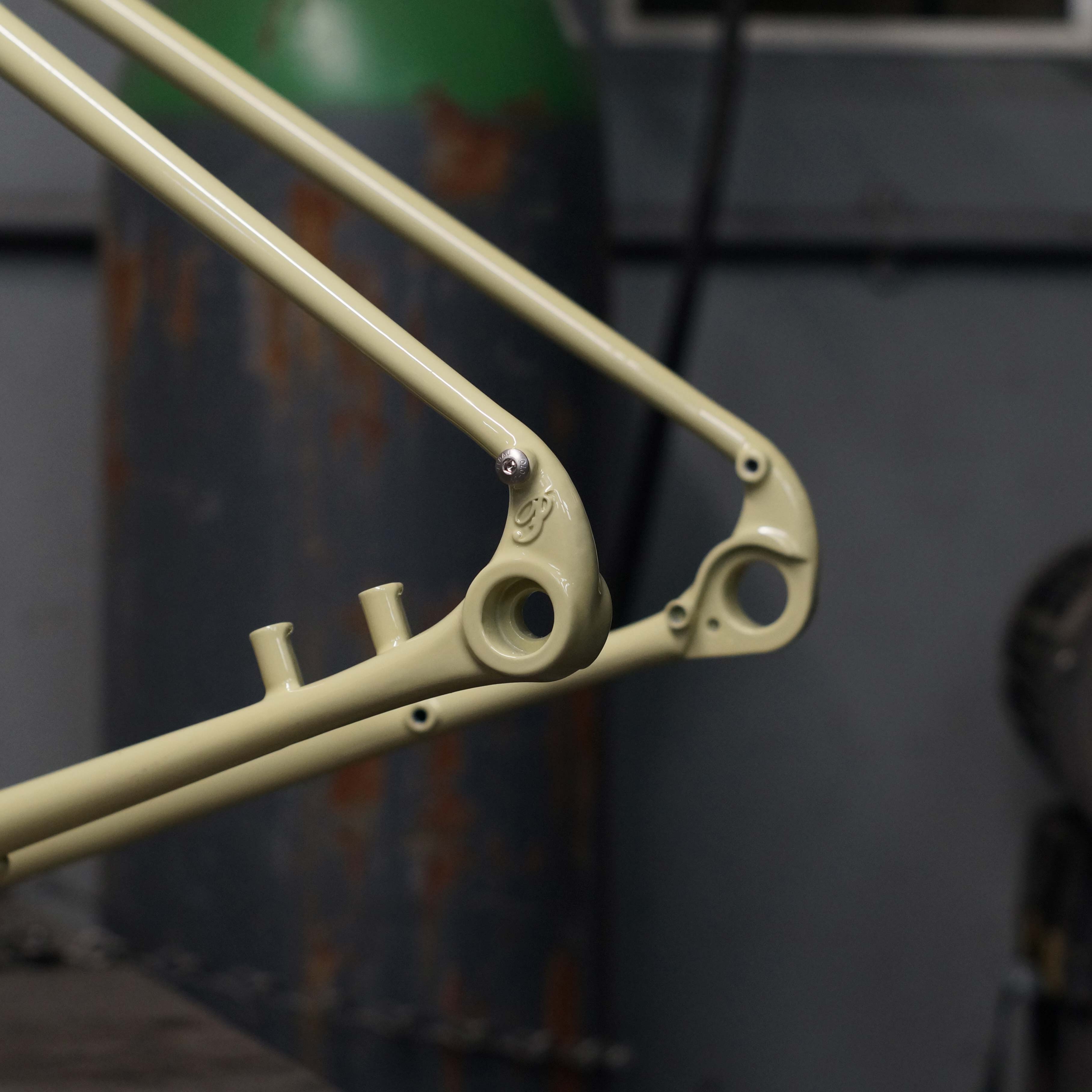 The frame is constructed from Reynolds 853 DZB steel tubing, with 3D printed seat lug, dropouts and chainstay yoke. The frame is “TIG welded with silver soldered lugs and drop outs.” The bike was built for the 2026 London Bespoked show and was kitted out with a range of eye-catching components including custom-painted colour-matched Shimano GRX brake callipers, Hope carbon wheels and a PNW components Loam dropper post.