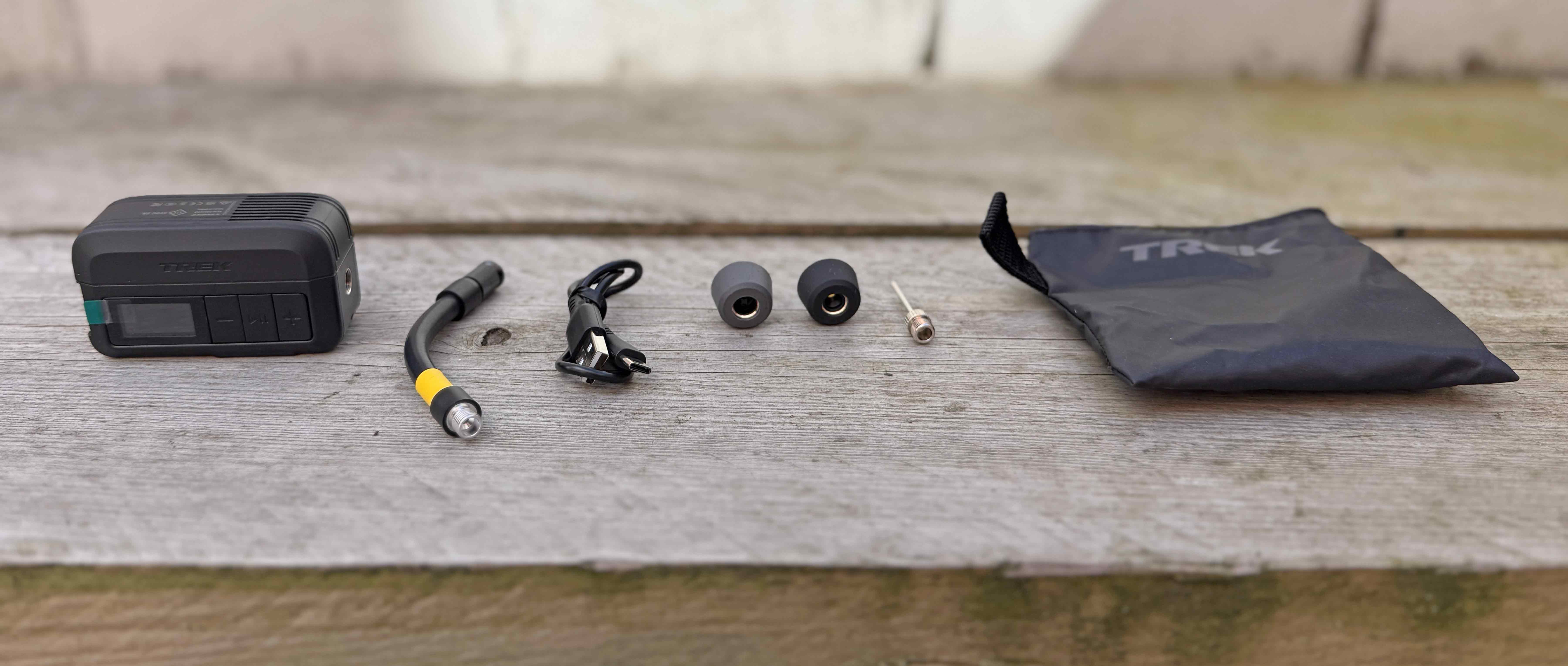 Trek claims that the Air Rush can inflate seven 700c x 45 mm tyres to 35 PSI from flat or four 29 x 2.4” tyres to 30 PSI from flat on one charge. In testing, it took less than a minute to inflate a 700x50mm gravel tyre from flat to our usual 20 PSI. Not as fast as a CO2 cartridge and also significantly noisier (around 95-100 decibels apparently), but no worries about the gas cylinder not working properly or our puny little cyclist arms getting tired from using a hand pump. Plus of course, the pump includes an accurate digital gauge so you can get your tyre pressures ‘just so’. A USB charge cable is included, as well as adaptors for Presta and Schrader, plus a flexible hose for awkward to reach valves and what looks like a needle valve for a football. We’re not sure whether that would be all that useful on the trail, so we’re going to be leaving it at home. You also get a little storage bag to fit everything in. The unit can be charged in around an hour.