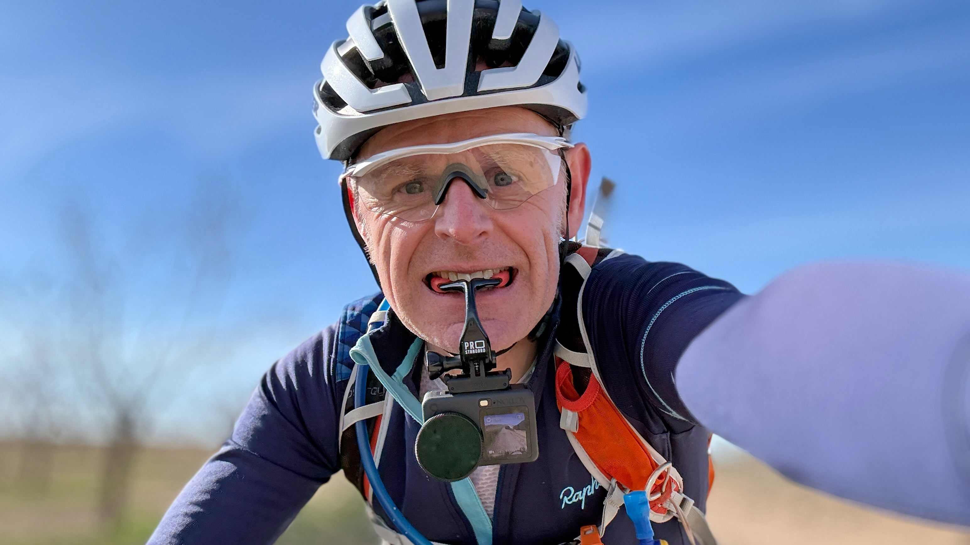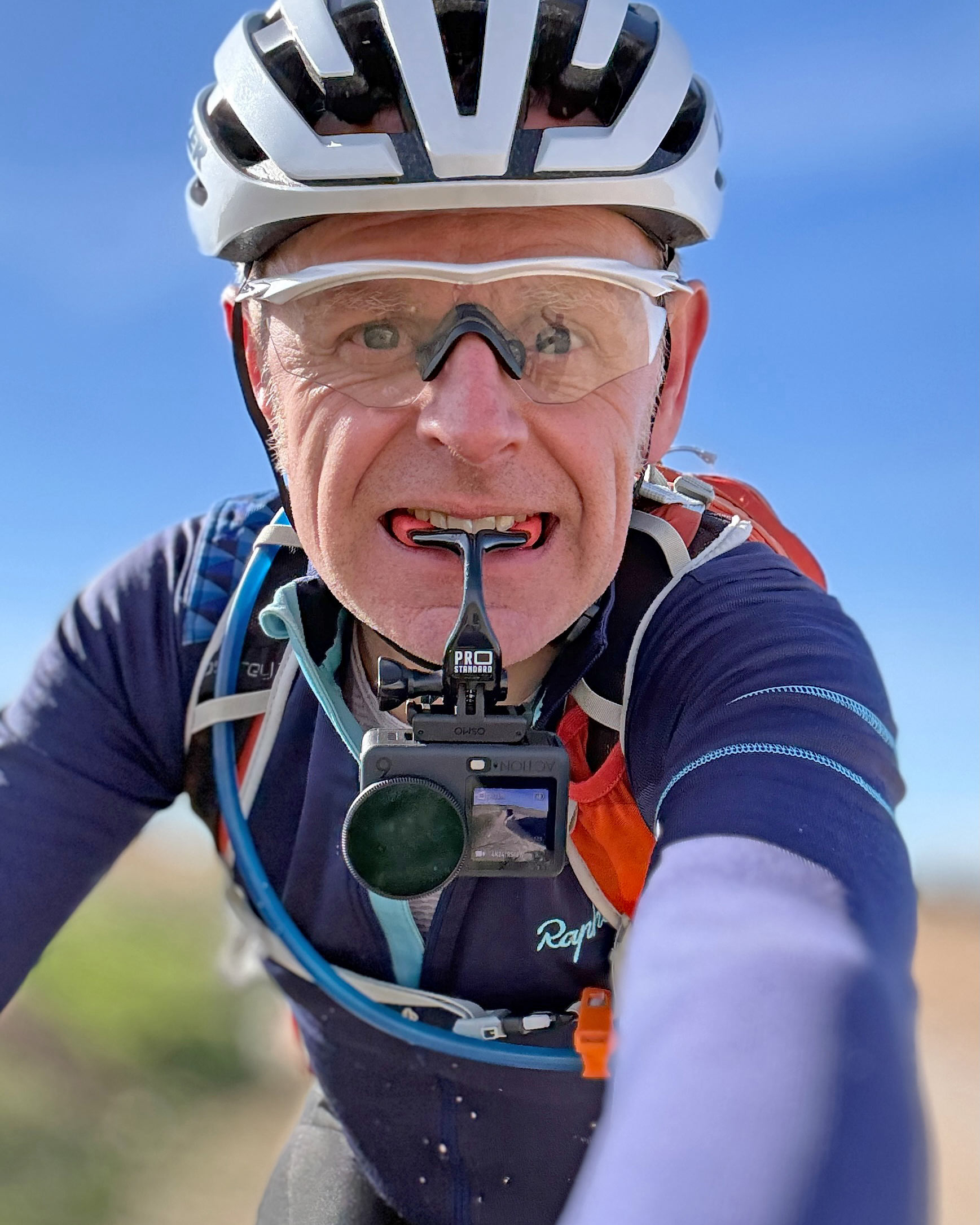 - Using different types of mounts, relevant to gravel riders and bikepackers – a “grill mount” which you hold between your teeth, a flotation handle, a mini tripod (for static views) and an out-front computer mount with the OA6 mounted underneath